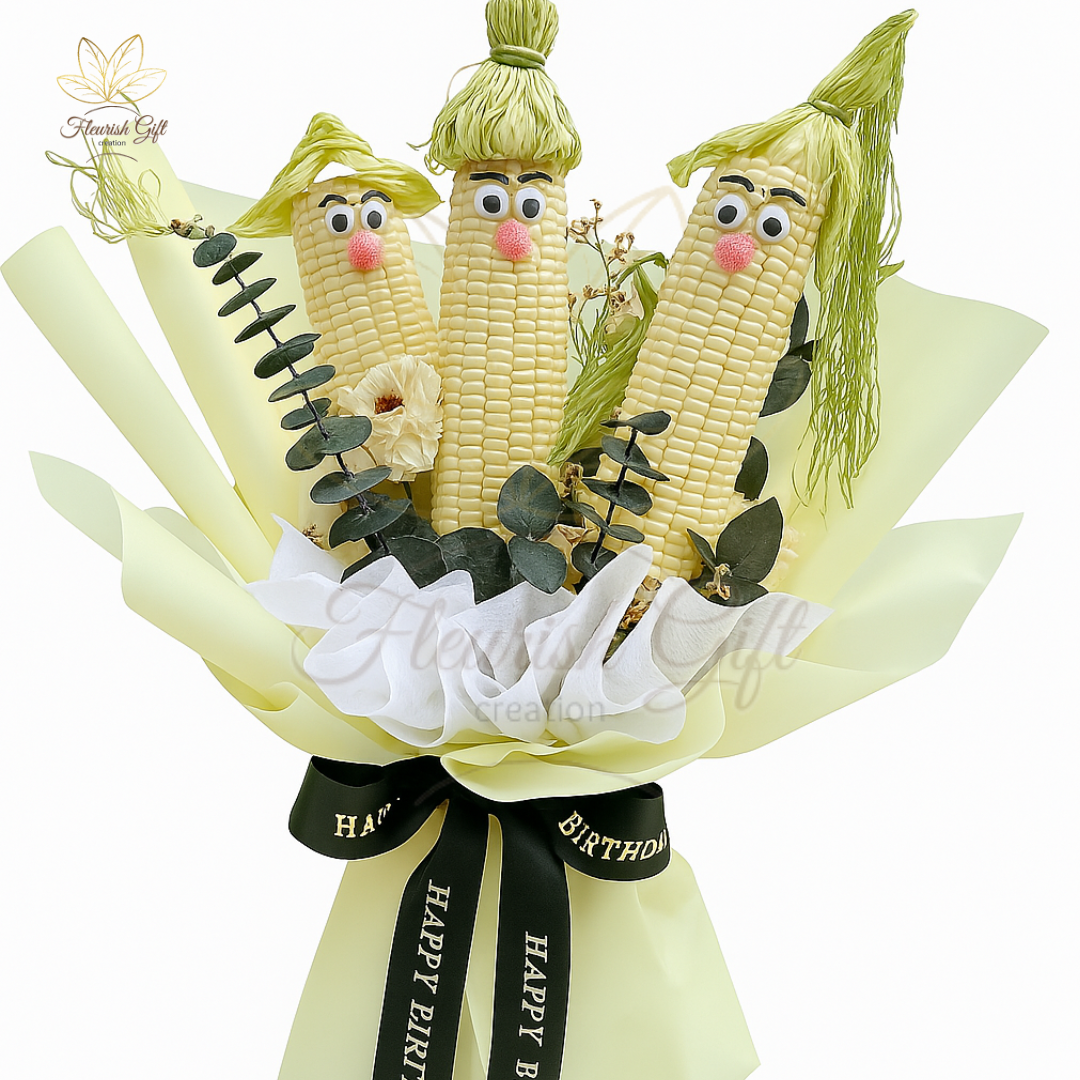 'Corny Encounter' is no coincidence, it's a delightful gift made from corn! This bouquet features corn in quirky shapes, with funny faces and hairstyles, as if saying, 'Finally, we meet!' It's not only adorable but also brings lots of joy and well wishes. A perfect gift for friends or family that will definitely make them smile!